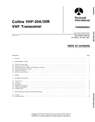 Collins VHF-20A, VHF-20B Installation Manual (part# 523-0765213-006)